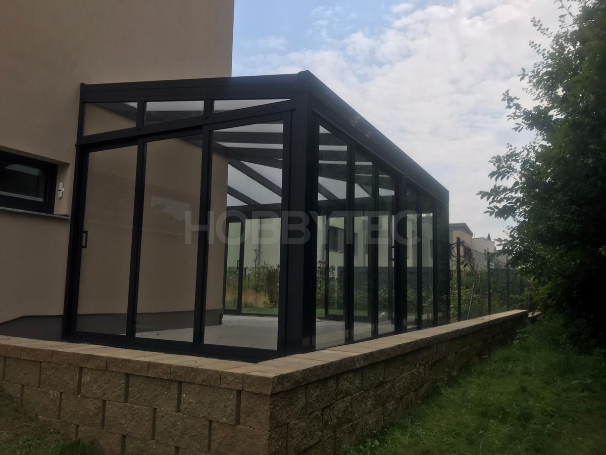 W przedniej ścianie ogrodu są umiejscowione drzwi przesuwne. Okna są ze szkła hartowanego w aluminiowym profilu. Konstrukcja aluminiowa jest dzięki swoim wspaniałym właściwościom w zupełności bezobsługowa.